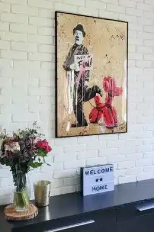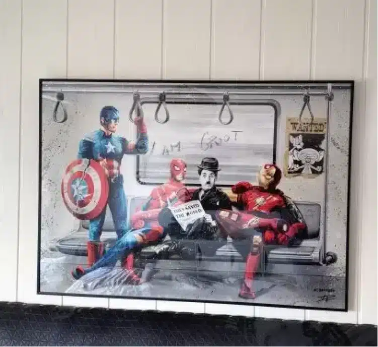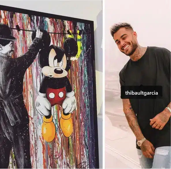 Each work that Durix paints tells us a story : Tintin surprised to find his Snowy transformed into a balloon, Mickey and Minnie kissing passionately in Times Square as well as Superman and Batman challenging each other's gaze to see which one will conquer the heart of a child ... Julien Durix enjoys mixing eras as well as characters , to better make us dream and immerse us in his universe where young and old come together. The acrylic paintings of this artist, carefully sketched, do not use collage or printing. The precision of his touch brings out the colors vividly and underlines the features of the figures.