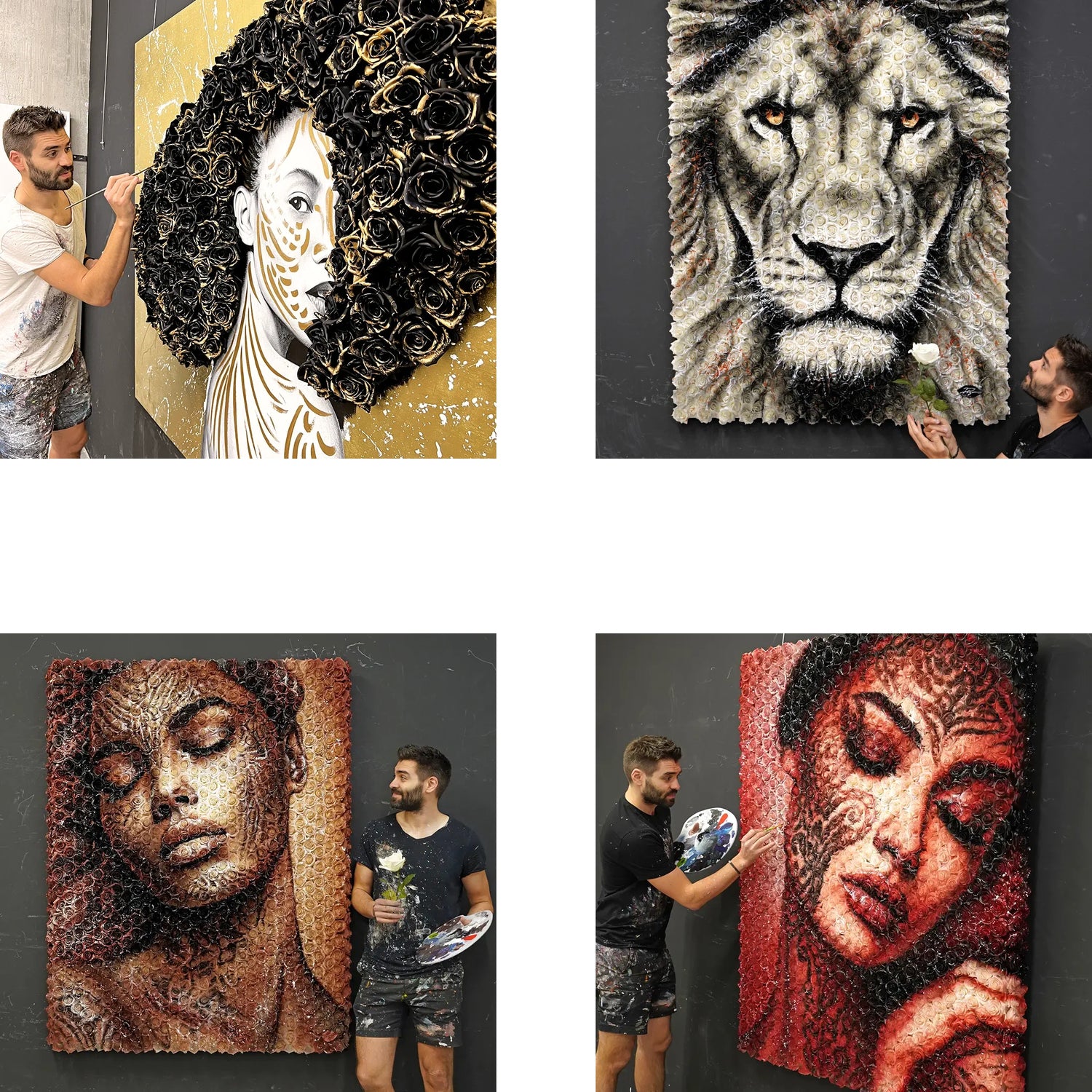 “La vie en rose” are enchanting paintings painted on a bed of roses placed directly on the canvas. The meticulous painting work on the roses gives an effect of relief and an impression of interaction with the painting, which varies depending on our point of view. The work thus comes to life and takes us on a journey into a poetic universe.