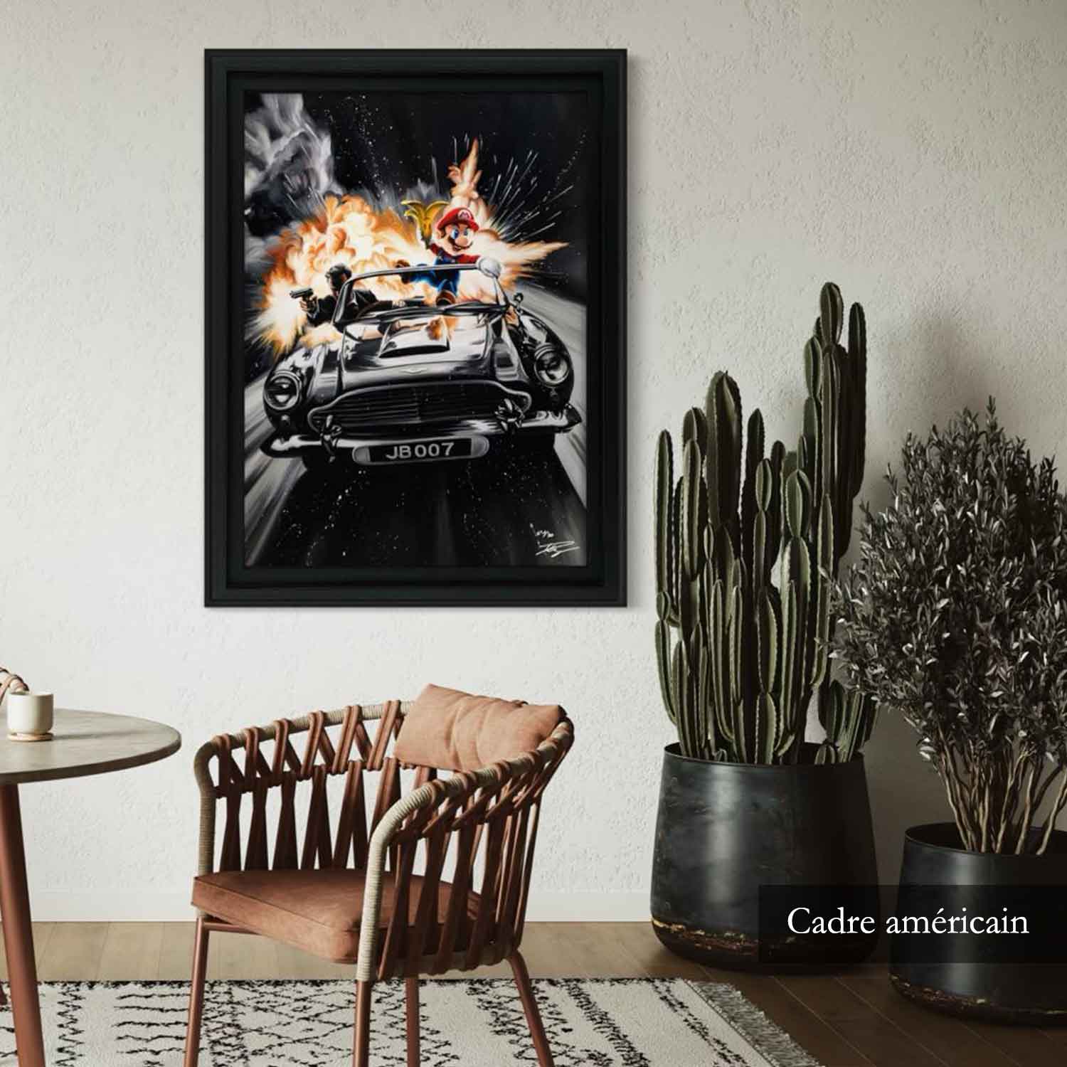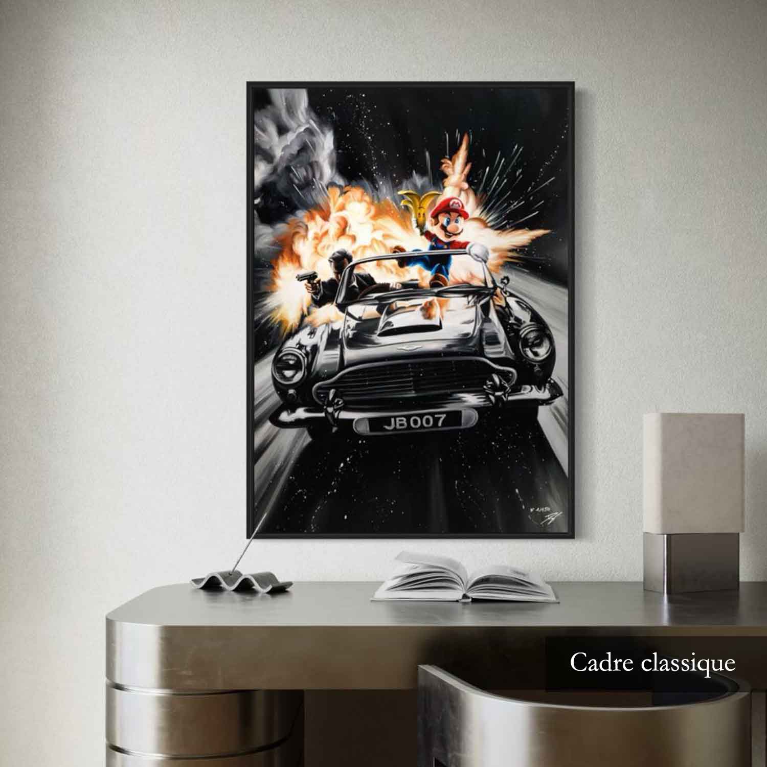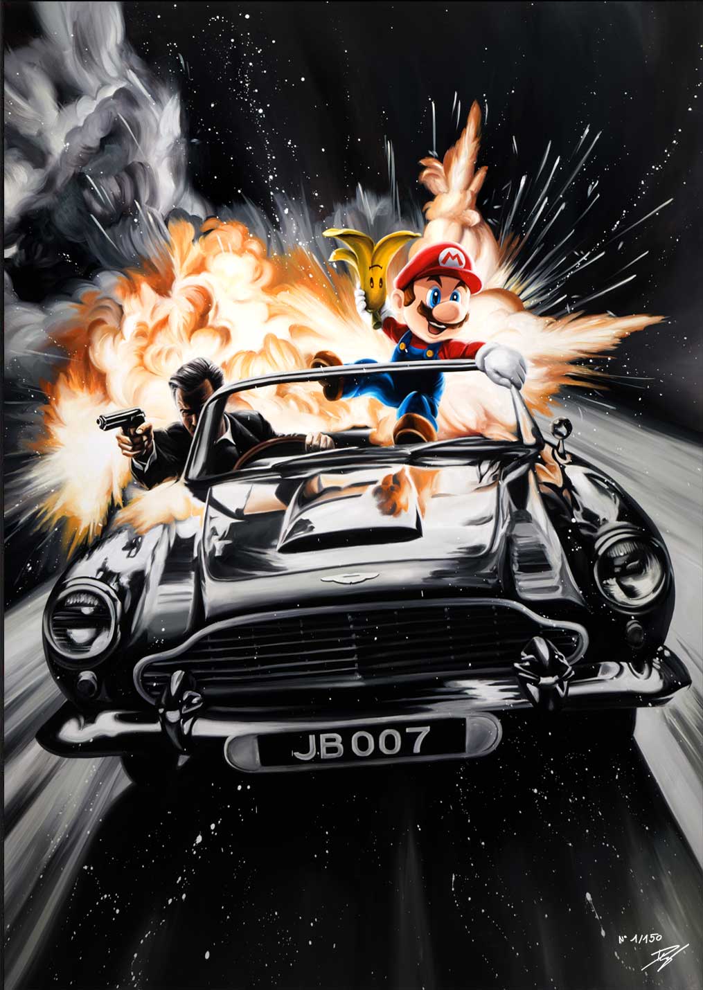 D’un côté, l’élégance et l’action avec l’incontournable Aston Martin et un agent secret prêt à tout pour s’en sortir. De l’autre, Mario, toujours aussi imprévisible, qui balance une peau de banane en plein milieu de ce chaos.