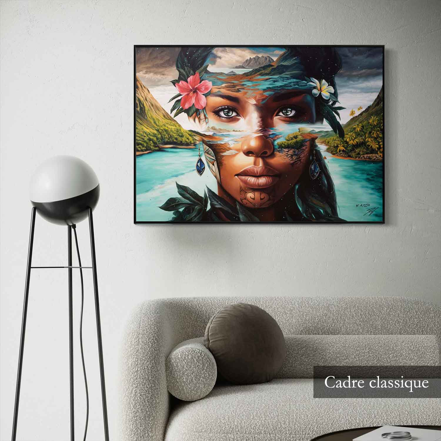 Les ornements floraux qui accompagnent son portrait et les teintes vibrant de la toile rappellent la richesse des couleurs et de la culture polynésienne, une culture qui célèbre la vie à travers l'art, la danse, et les traditions orales.