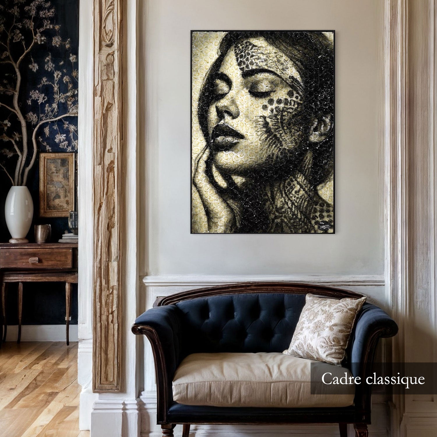 - Le cadre classique : Fabriqué en bois noir, ce choix intemporel saura mettre en valeur vos œuvres avec raffinement.