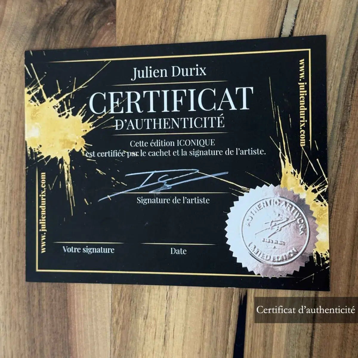 Toutes les impressions d’art sont signées et numérotées à l’avant. Depuis le 09/04/2023 elle sont livrées avec un certificat d’authenticité signée par Julien Durix.Pour les 10 premiers numéros, nous les attribuons en suivant l’ordre des commandes passées. Toutefois, si vous souhaitez choisir un numéro spécifique parmi les éditions disponibles, nous nous ferons un plaisir d’accommoder votre demande, sous réserve de disponibilité.