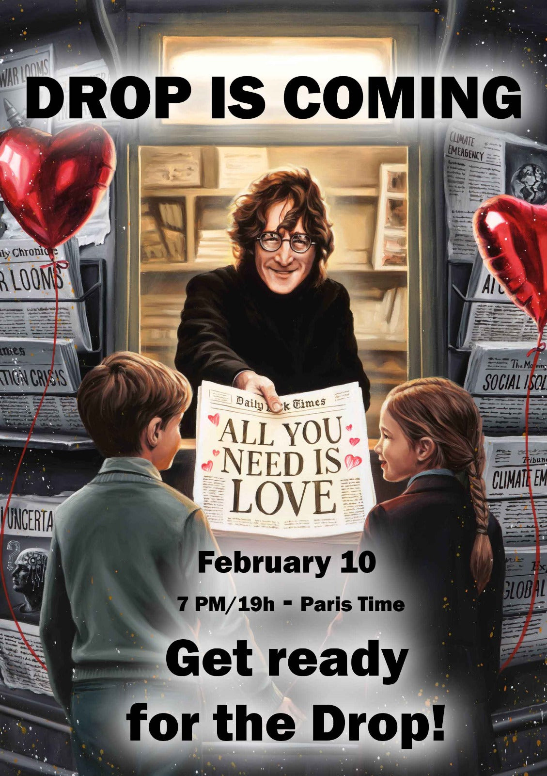 Entourée de unes remplies de peur, de crises et d’urgence, une seule se distingue, portant un message essentiel : All You Need Is Love.